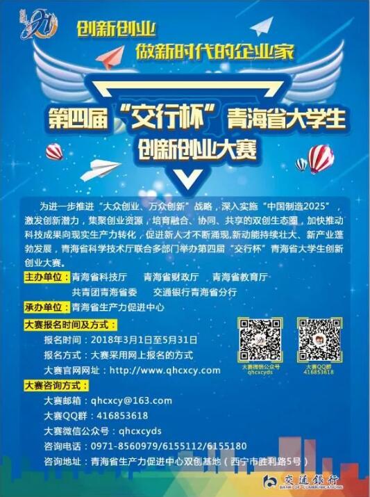 根據(jù)《第四屆“交行杯”青海省大學(xué)生創(chuàng)新創(chuàng)業(yè)大賽實(shí)施方案》的要求,3月1日起正式啟動第四屆“交行杯”青海省大學(xué)生創(chuàng)新創(chuàng)業(yè)大賽報(bào)名工作,報(bào)名截