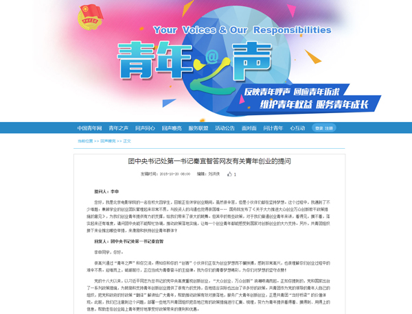 10月20日,團(tuán)中央書記處第一書記秦宜智通過“青年之聲”互動(dòng)社交平臺(tái)回答網(wǎng)友提問。網(wǎng)頁截圖 中國青年網(wǎng)北京10月20日電(記者 劉妍彤) “我為你們的青春夢想喝彩