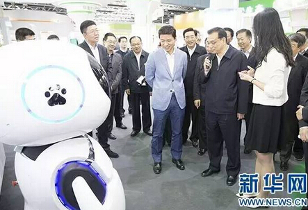 10月19日,中共中央政治局常委、國務(wù)院總理李克強(qiáng)在北京出席首屆“全國大眾創(chuàng)業(yè)萬眾創(chuàng)新活動(dòng)周”,并考察主題展區(qū)。這是李克強(qiáng)在與百度公司自主研發(fā)的機(jī)器人交談。